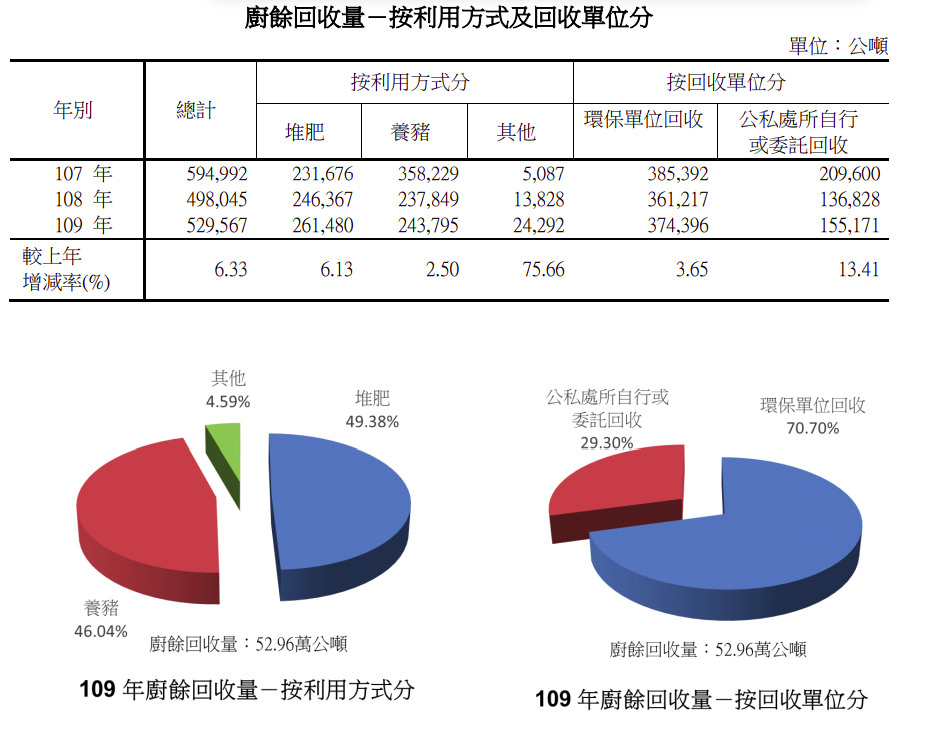 本系列文章針對台灣各縣市廚餘回收處理及源頭減量政策做綜合分析與評論,資料時間範圍涵蓋民國101年(2012)至113年(2024)。評論的基礎資料主要來自於各縣市 112年度(2023)廚餘回收處理績效報告以及113年度(2024)廚餘回收處理績效報告,以及其他過去零散的新聞報導或各環保機關的公開統計資訊。基礎資料的真實性與完整性必須越高越好,評論才能足夠客觀準確,可惜在目前可公開查詢到的新聞報導與政府公開資訊中,真實性與完整性還不能說非常良好。若將資料分成量化及質化兩大類:量化的資料必須有長期的數據紀錄、統計和分析,才能比較各縣市的優劣,這一點各縣市政府除了依循中央的規定,有定期紀錄廢棄物的總量及各類分佈之外,其他如非政府環保單位收受的廚餘量,例如都會區許多公寓大樓會委託民間廚餘回收業者收受廚餘,針對這部份的廚餘回收量,雖然政府曾納入統計資料中,在環境部110年(2021)環境保護統計年報中還看得到統計數字,如下圖:公私處所自行或委託回收,佔所有廚餘回收量將近30%,佔比不低,然而之後從111年到114的統計年報卻沒有揭露這項資料,不知環境部為何不公佈了。雖然這部份廚餘回收業者理論上須依法申報廚餘回收量,但也許是因為量太大、地下回收業者太多,政府追蹤稽查困難,便成為量化資料的一大缺口。