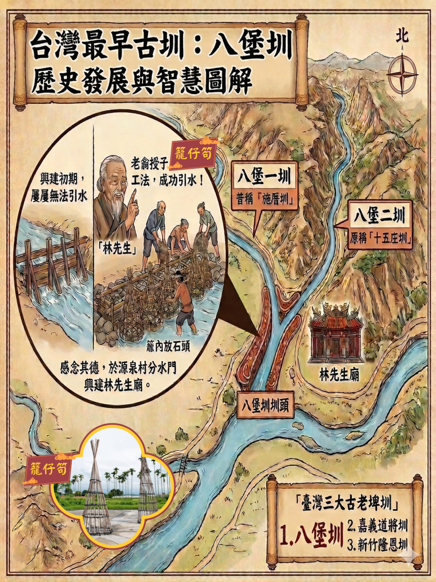 八堡圳是台灣最早的古圳,與嘉義道將圳和新竹隆恩圳並稱「臺灣三大古老埤圳」,其圳頭位在八卦台地南麓、二水鄉的鼻仔頭,並在二水鄉的源泉村分成八堡一圳與二圳。八堡一圳昔稱施厝圳,是由施琅的族侄施世榜籌款興建,於1709年開工,1719年完工,從位於鼻仔頭的圳頭開始,沿著八卦台地西麓一路往西北;興建初期屢屢無法引水入圳,後有一老翁自稱姓林,授予工法,以內放石頭的「籠仔笱」築堤壩,才成功引水入圳。後人感念其德,於源泉村的八堡一、二圳分水門附近興建林先生廟以為紀念。八堡二圳原稱十五庄圳,是1721年由埔心鄉人黃仕卿攔八堡圳水興設,但時常崩毀損壞,數次由民間集資搶修重建,並發展出輪流管理方式,至1906年合併於八堡圳。八堡圳幾乎涵蓋整個彰化平原,灌溉面積廣達1.9萬餘公頃,充分體現先民群策群力批荊斬棘的精神及運用自然資源的智慧。8, 9, 10, 11