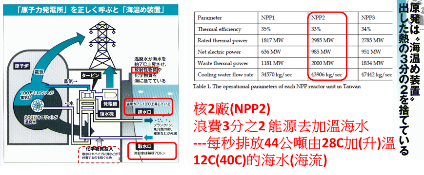 早在 1987年,台灣大學黃哲崇副教授即指出,核三廠的溫排水是造成墾丁國家公園南灣珊瑚大量白化的主因。這證明核電廠在盛夏排放的熱廢水(水溫超過 30 C),對生態系統造成巨大的「熱壓力」。