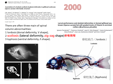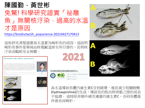 - 調查結果:環保署專案小組中研院邵廣昭的模擬實驗顯示,高水溫是畸形的原因之一。水溫超過 37 C 會破壞魚體內的維他命 C,導致骨骼生長物質不足而畸形。