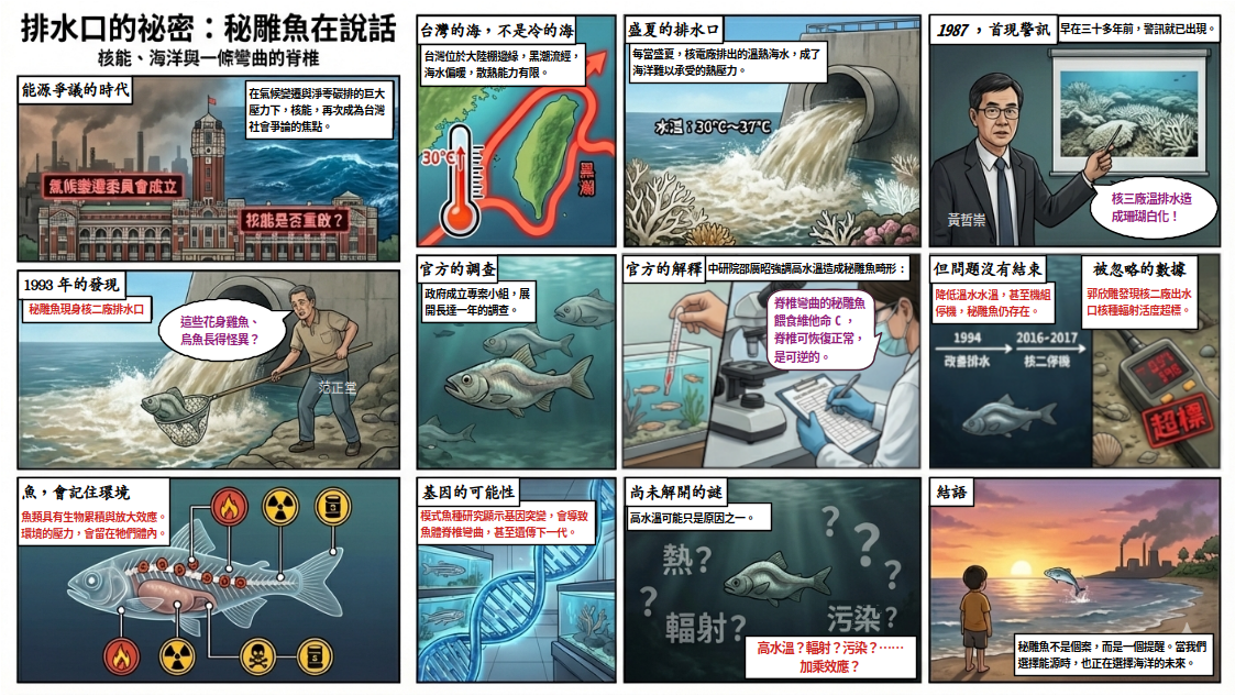 近年來,因應氣候變遷、淨零碳排及AI產業需電的壓力,台灣社會對重啟核能的討論再度升溫。總統府成立的氣候變遷委員會,以及部分官方人士將核能稱為「低碳能源」的態度,使能源轉型路徑面臨滾動式調整的呼聲。然而,當我們討論核能的必要性時,一個持續數十年的環境警訊——北海岸核二廠出水口的「秘雕魚」——提醒我們必須正視其對海洋生態的複合性衝擊。